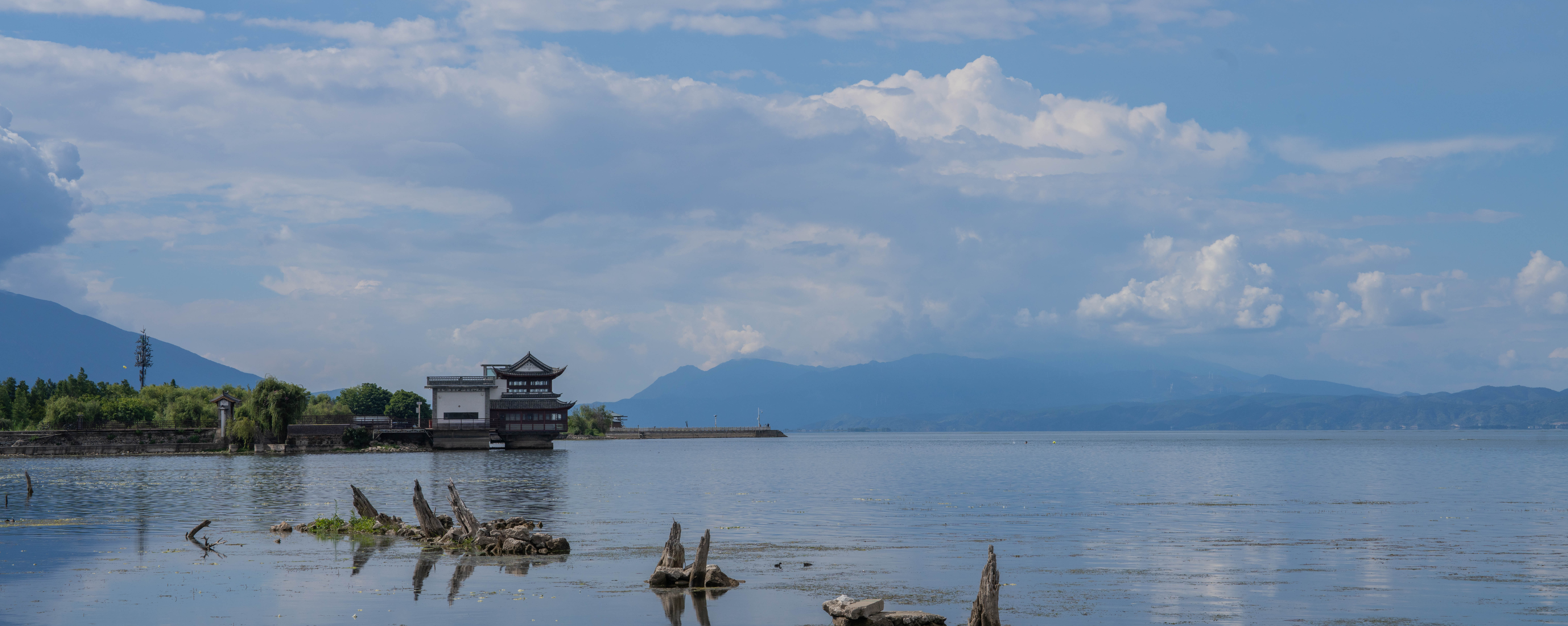 云影徘徊,如镜的湖面映照出万古的苍茫。在那片澄澈的蔚蓝里,飞檐的一角正静静守望一场关于天光与湖山的无声告白。